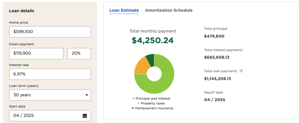 For homebuyers, the numbers are daunting. At the median price a $599,500 home with a 30-year mortgage and 20% down now costs $4,250 monthly at 6.97% interest, up from $3,091 at 3%. Over the loan’s life, you’d pay an extra $417,283 in interest and need an additional $1,159 each month compared to a few years ago.