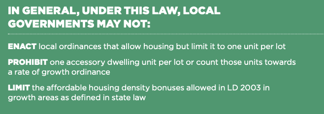 - Accessory Dwelling Units (ADUs): Mandates allowing at least one ADU on any lot with a single-family home, including non-conforming lots if dimensional requirements are met; pre-LD 2003 “illegal” ADUs must be legalized. ADUs do not count in density limitations.